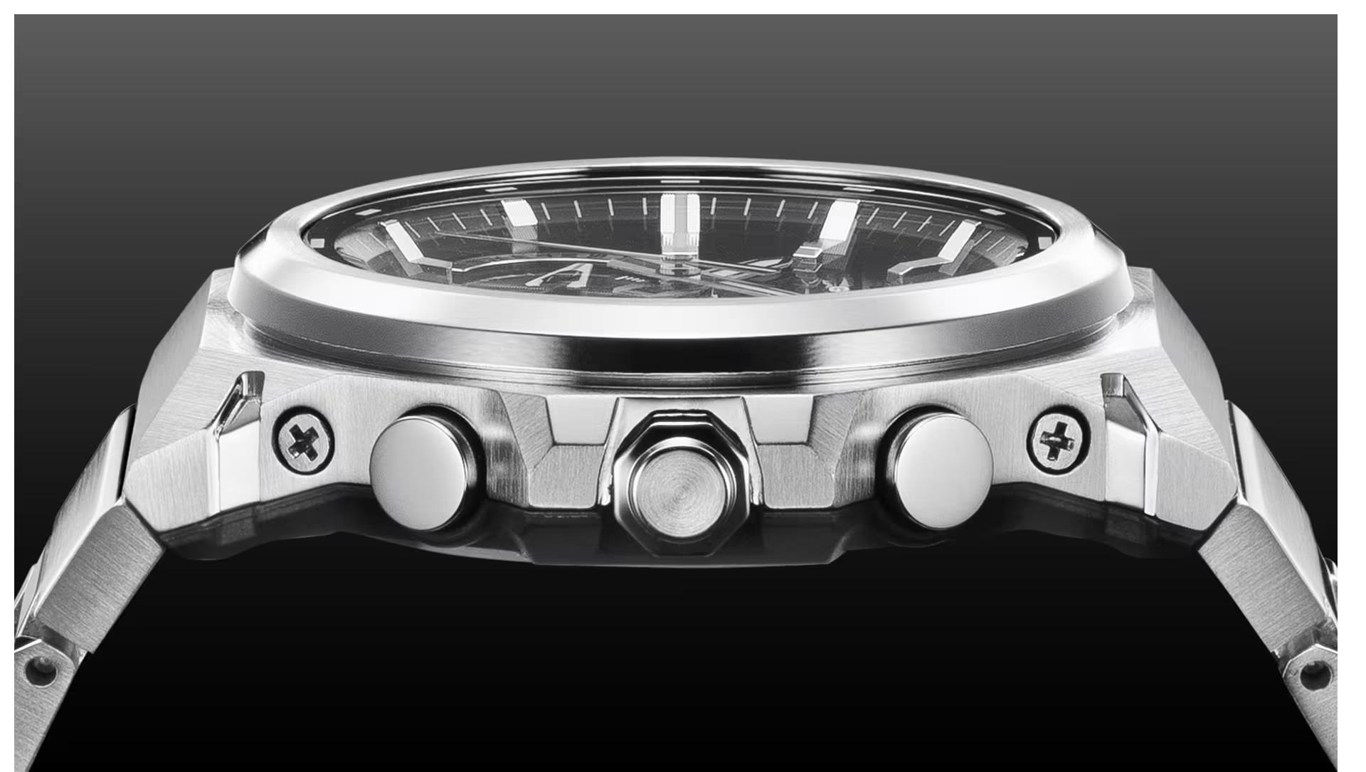 Yksisuuntaiset hairline-viimeistelyt korostavat muotoja, ja logoton kehä tukee minimalistista ilmettä. harjattu viimeistely yhdistettynä peilikiillotukseen luo metalliin tekstuuria, joka muuttuu valon mukana. Ranneke on viimeistelty vastaavalla tavalla, ja kolmitaitteinen lukko tuo sekä istuvuutta että elegantin tuntua ranteeseen.